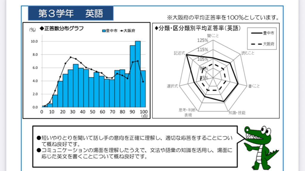 このグラフは豊中市ホームページで公開されている「英語の結果」です。マチカネワニのマチカネくんが講評しています。