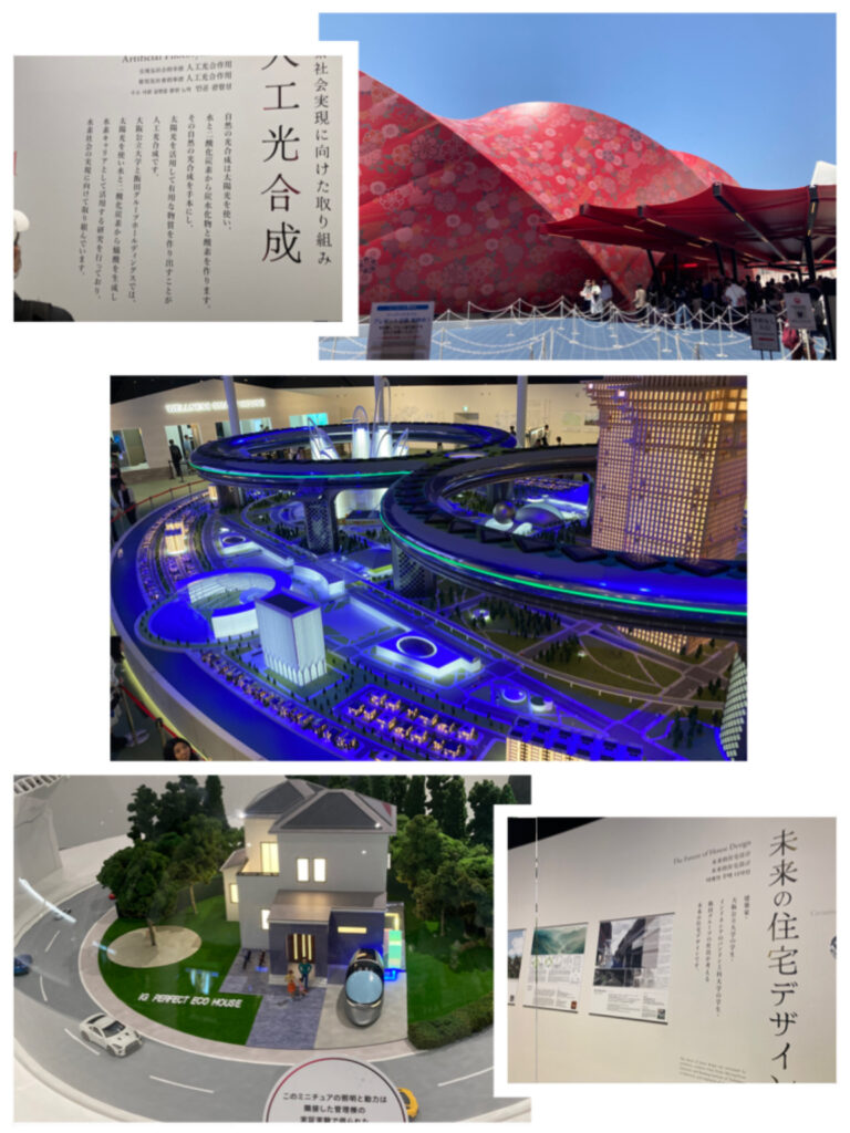 展示内容では、日本が最先端を走る人工光合成技術に驚かされました。光+二酸化炭素+触媒によってギ酸(CO₂の固定と再利用に利用)+水素(発電に使用)を生成する仕組みが紹介されており、この技術を活用したスマートハウスが展示されています。また、未来のスマートシティのジオラマでは、ミャクミャクさまが隠れているという遊び心ある設計も!