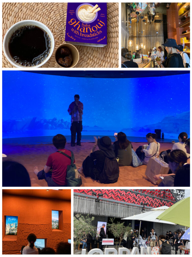 ヨルダンコーヒー(700円)にはデーツのドライフルーツがおまけでつき、お土産には、焼きナスのディップ付きクラッカー(400円)を購入。万博らしからぬ手頃な価格。焼きなすディップはとても美味しかったので、また買いたいです!