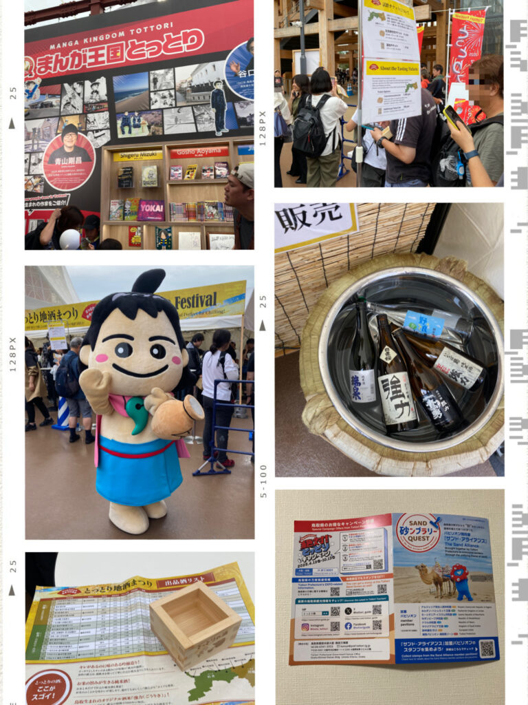 また、関西パビリオンでは「とっとり地酒まつり」が開催中でした。因幡・伯備地方の地酒を、0.5合づつ頂けます。お酒をいただく0.5合枡とおつまみ(カニせんべいでした)がついて1,000円、おかわりは枡2杯で700円という価格設定。居酒屋感覚で美味しい地酒が楽しめる絶好のチャンス。足は限界だったのですが、誘惑には勝てず、日本酒を堪能してしまいました!
