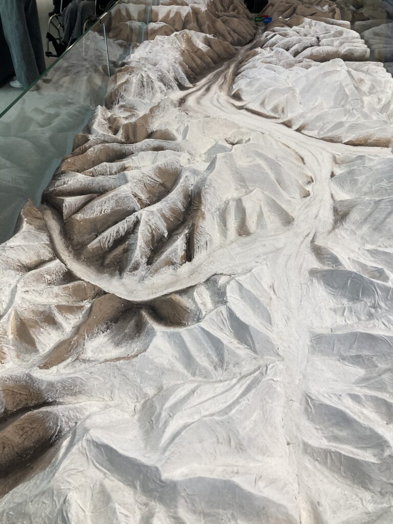 展示では民族衣装も目を引きましたが、私が特に気になったのは「フェドチェンコ氷河」のジオラマ。世界最大級で全長およそ77km。氷河とは長期間積もった雪が圧縮され、自重でゆっくり流れていく巨大な氷のかたまりのことだそうです。模型では地面の露出が多く、温暖化による後退が現実味を持って伝わってきました。