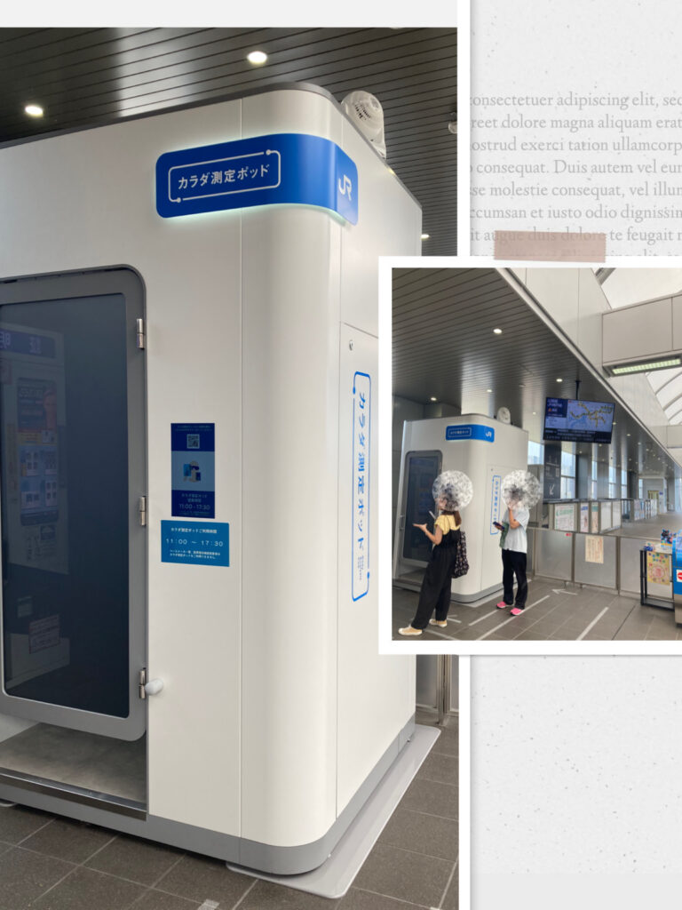 カラダ測定ポッドは本当に改札のすぐ横にあり、びっくりしました。万博のヘルスケアパビリオンにあるものと同じ…と知らない方も多いのではないでしょうか。