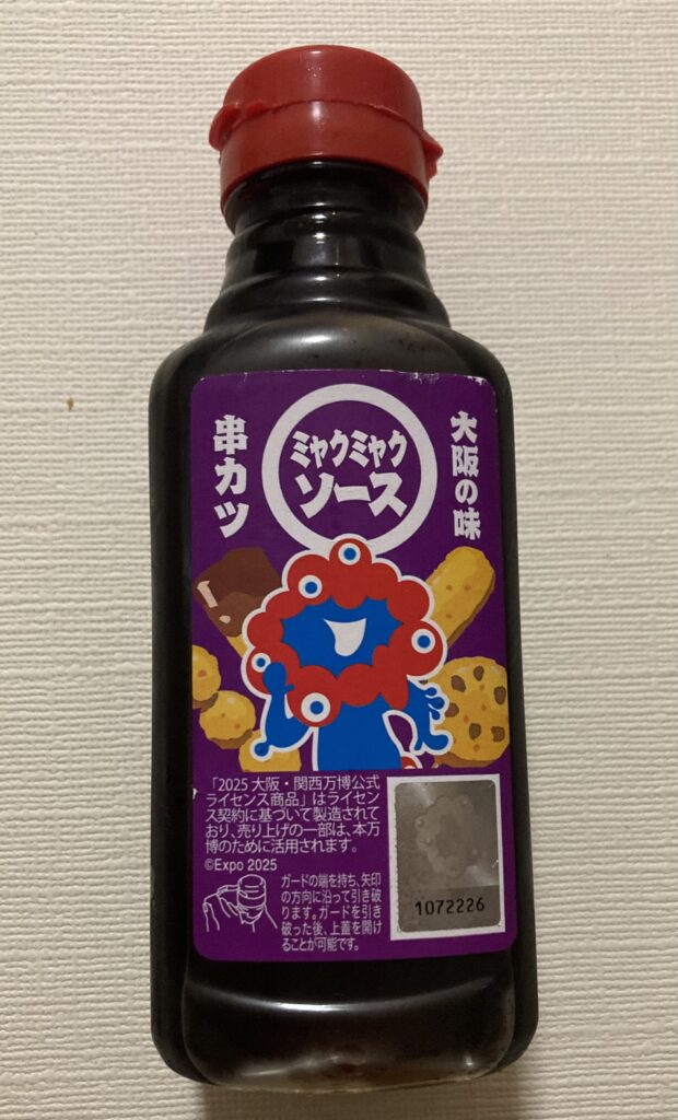 万博土産といえばミャクミャクグッズ。中でも「串カツソース」は、夫がすっかり気に入ってリピートしている一品です。